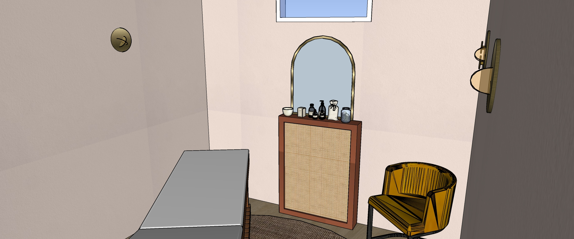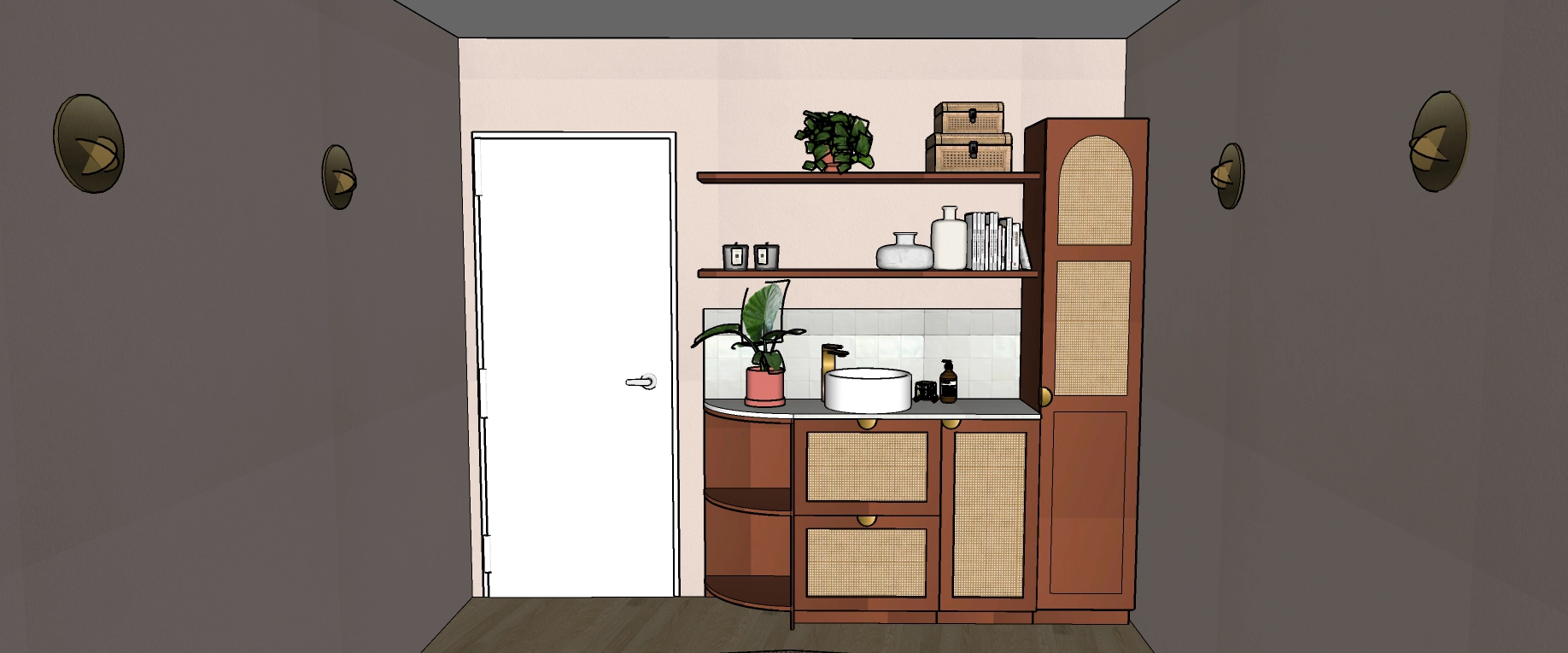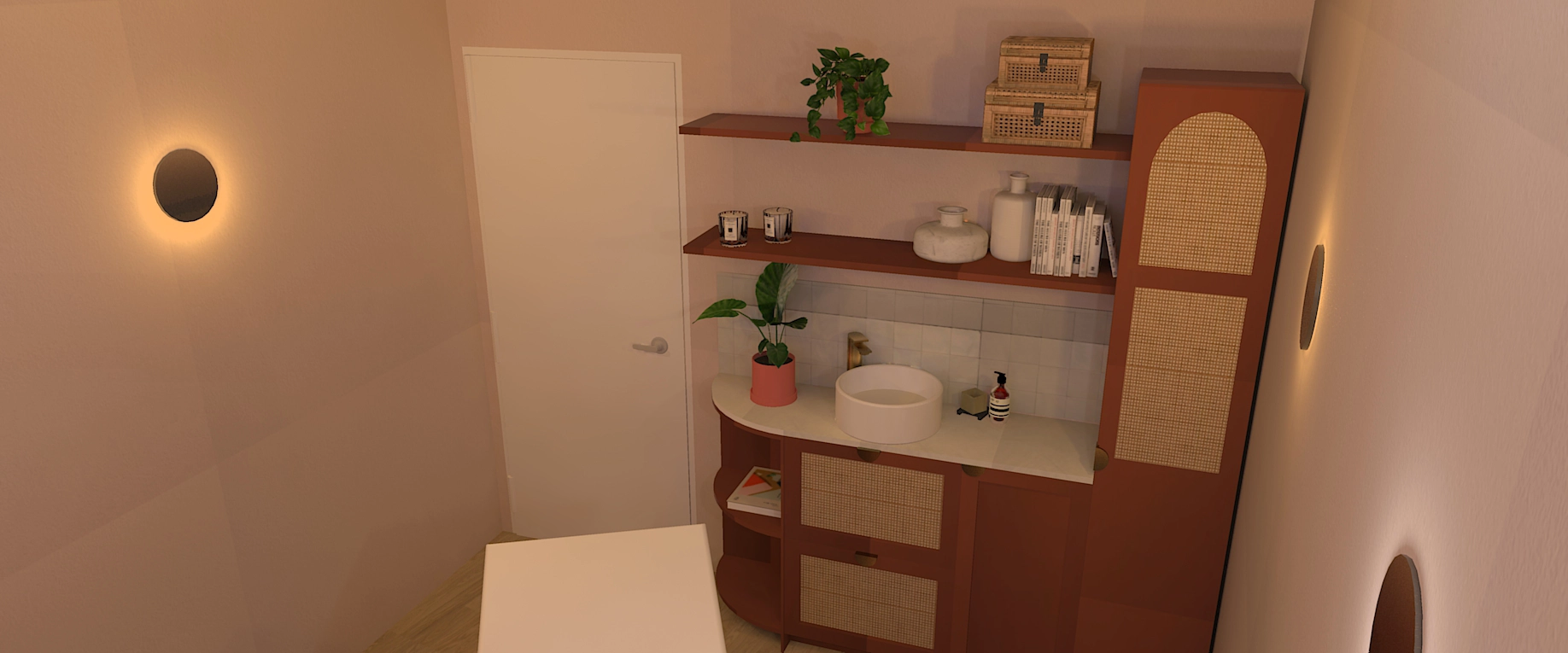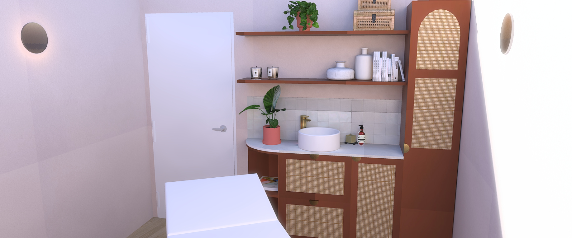 Dans son discours, il y avait cette pointe de féminité douce, cette chaleur naturelle… quelque chose qui m’a immédiatement évoqué l’ambiance des hammams et riads marocains : des couleurs qui réchauffent, rassurent, et évoquent un voyage sensoriel. Elle aimait le naturel, le bois, les textures authentiques. Et surtout, elle avait un véritable coup de cœur pour les nuances de rose et de terracotta. Ce mélange est devenu le fil conducteur du projet.
