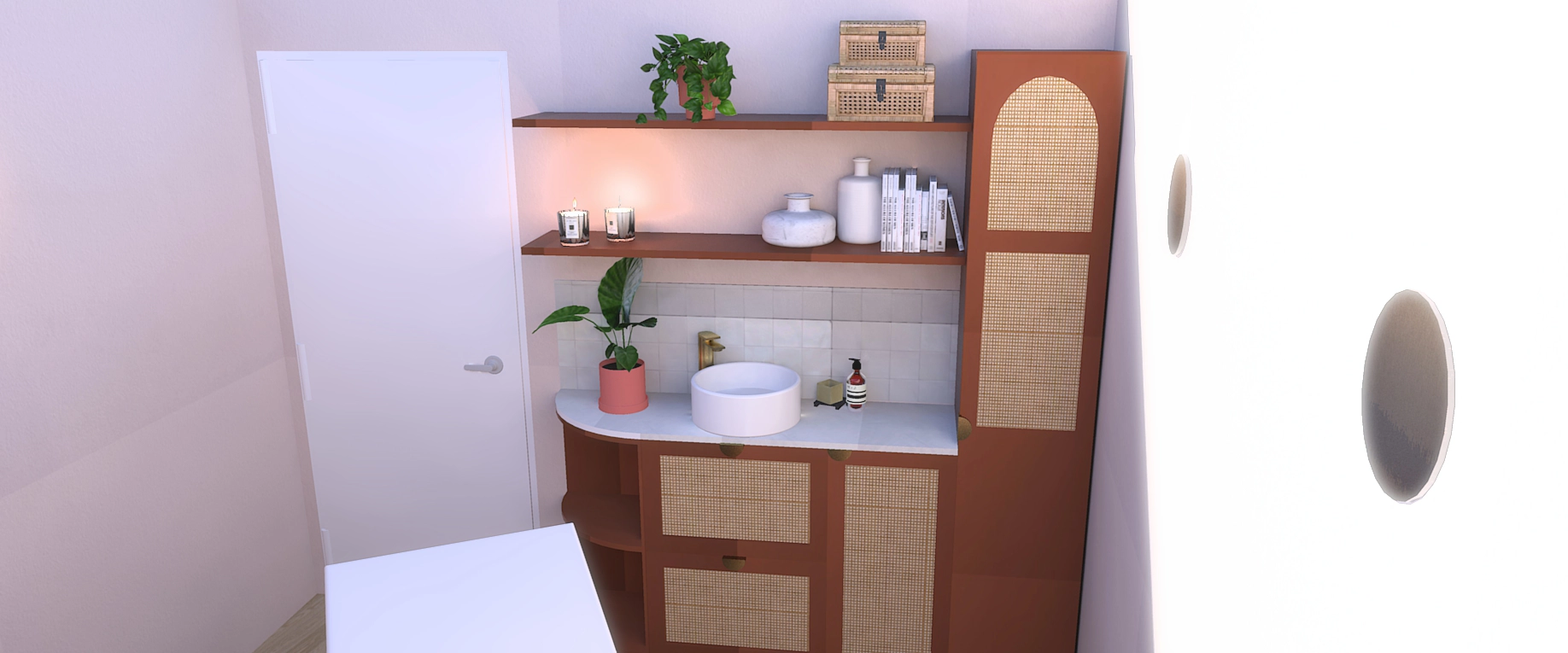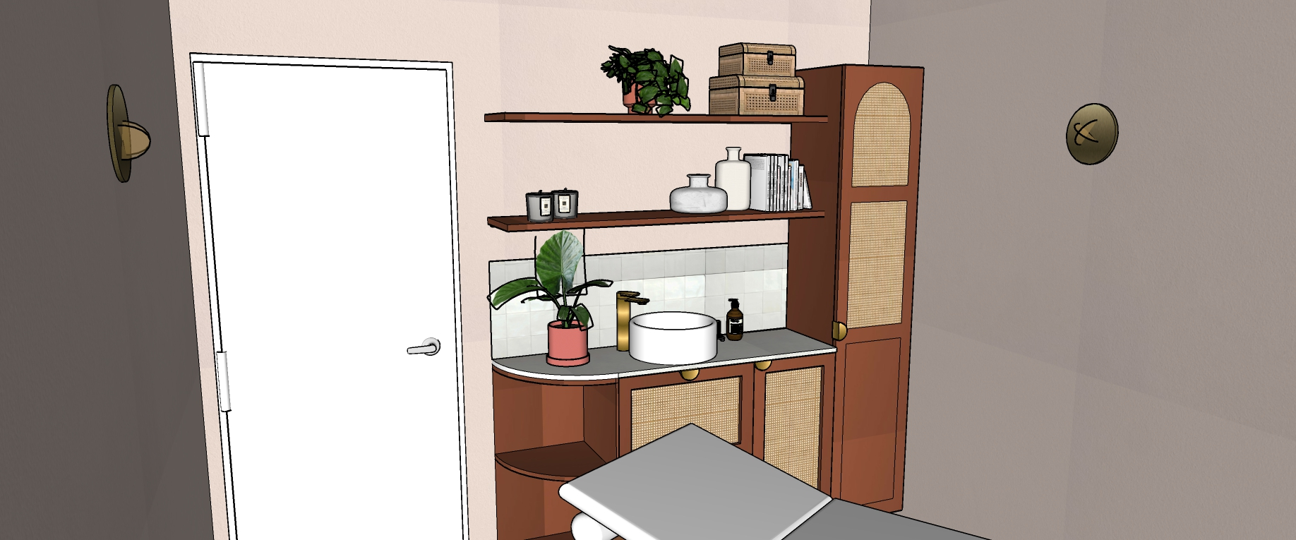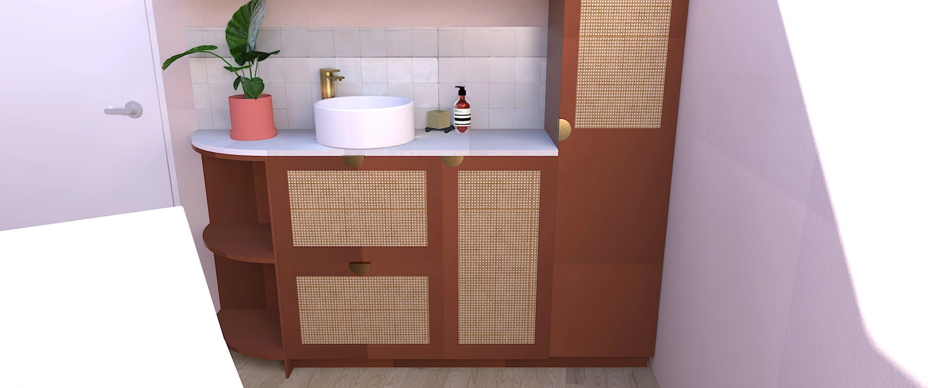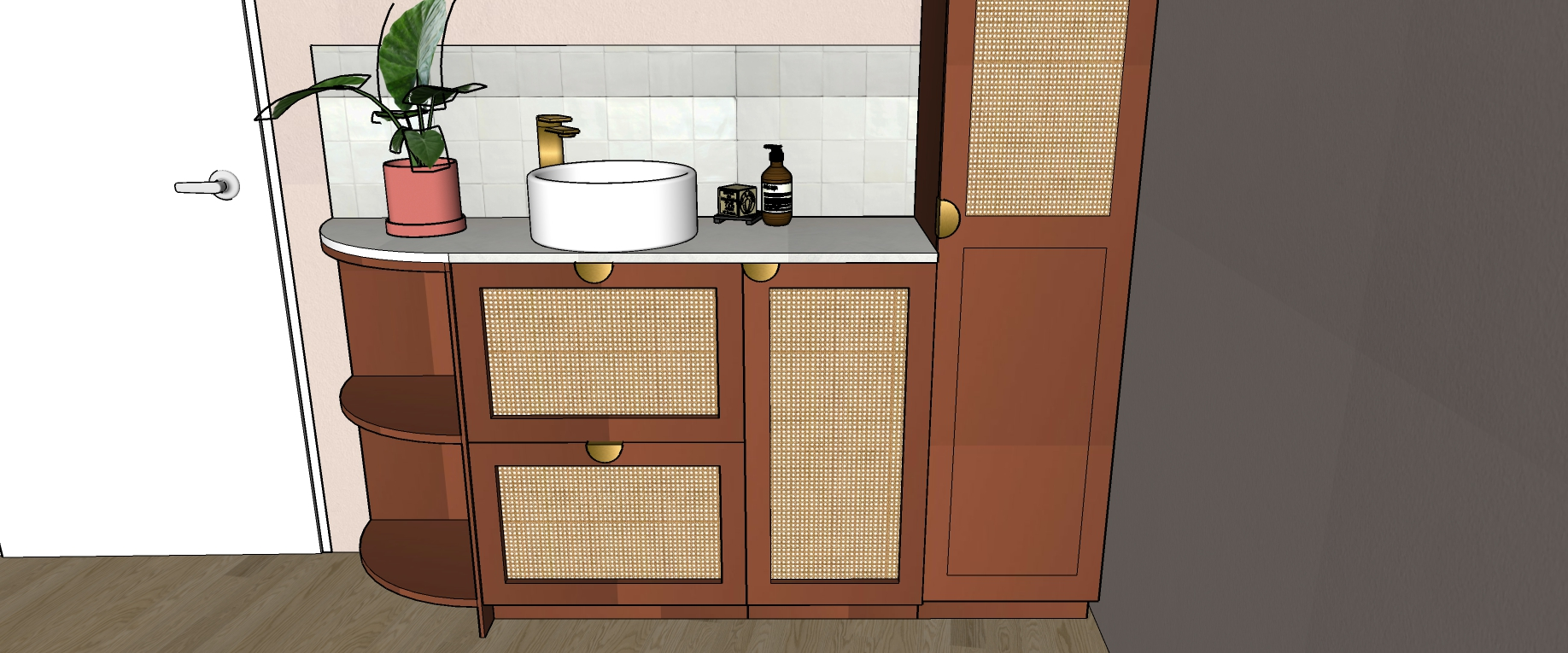 Dans son discours, il y avait cette pointe de féminité douce, cette chaleur naturelle… quelque chose qui m’a immédiatement évoqué l’ambiance des hammams et riads marocains : des couleurs qui réchauffent, rassurent, et évoquent un voyage sensoriel. Elle aimait le naturel, le bois, les textures authentiques. Et surtout, elle avait un véritable coup de cœur pour les nuances de rose et de terracotta. Ce mélange est devenu le fil conducteur du projet.